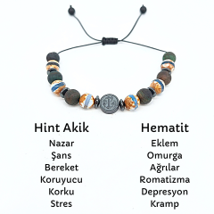 Bu benzersiz bileklik, Hint Akik ve Hematit gibi doğal taşların birleşiminden oluşur. Hint Akik, binlerce yıldır insanlar tarafından şans getirdiğine inanılan bir taştır. Hematit ise güçlü bir koruyucu enerjiye sahiptir ve negatif enerjileri uzaklaştırır. Bir araya geldiklerinde ise, taşların enerjileri birleşerek kişiye güç, koruma ve zindelik verir.