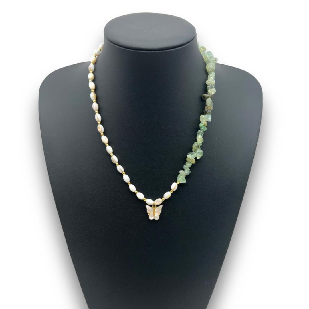 Sedef ve prehnit kelebek uçlu doğal taş kolye 5 - 10 mm arası orjinal doğal taşlardan oluşmaktadır.